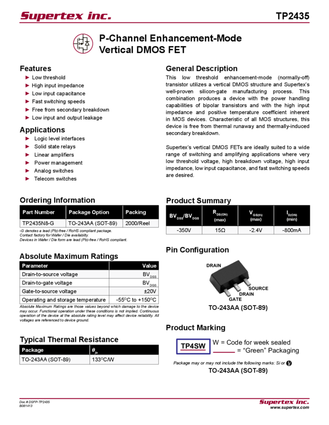 TP2435 Datasheet - P-Channel Enhancement-Mode Vertical DMOS FET (06/27/2014)