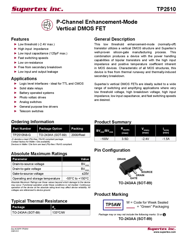 TP2510 Datasheet - P-Channel Enhancement-Mode Vertical DMOS FET (06/27/2014)