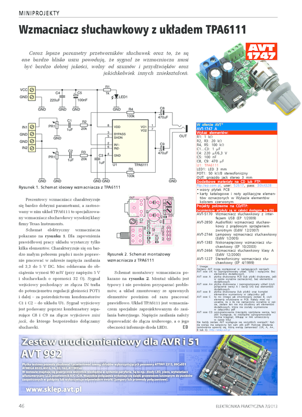 AVT1747 A Wzmacniacz słuchawkowy z układem TPA6111 - płytka drukowana