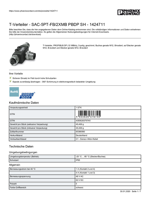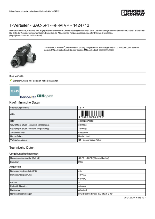 Phoenix Contact 1424712 Trójnik złącze męskie proste, złącze żeńskie proste Ilość pinów: 5 1 szt.