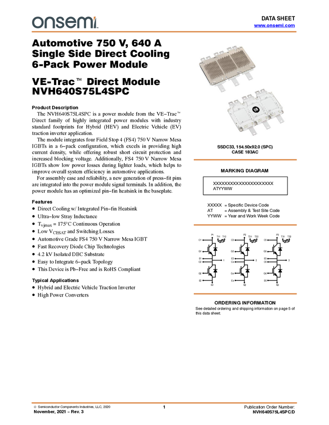 VE-Trac Direct: High Performance Single Side Direct Cooling Three-Phase 6-Pack Power Module for Automotive, 750V, 950A, Long Tabs