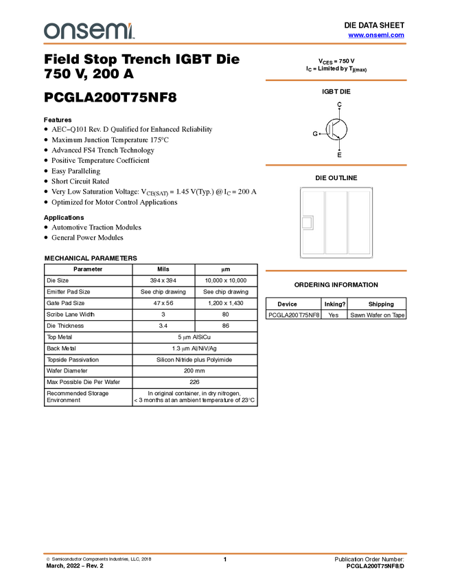 VE-Trac Chip: IGBT Bare Die for Automotive, 750V, 200A