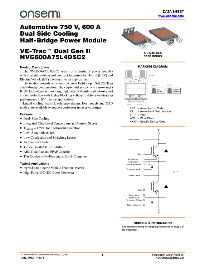 VE-Trac Dual - Dual Side Cooling Half-Bridge Power Module for Automotive, 750V, 800A, 90° Power Tabs
