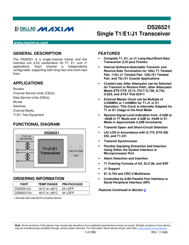 DS21Q352, DS21Q354, DS21Q552, DS21Q554 Quad T1/E1 Transceiver (3.3V, 5.0V)