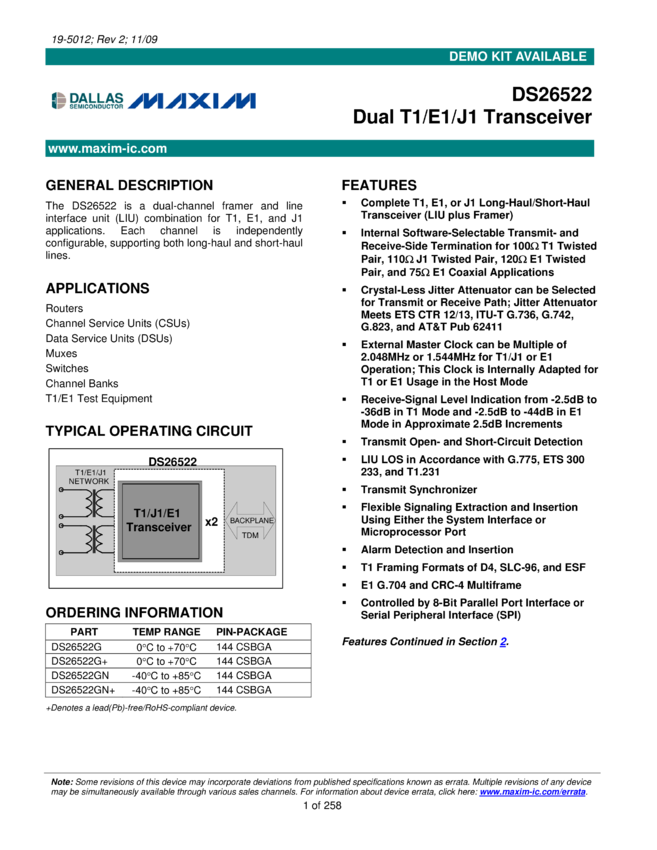 DS21352, DS21552 3.3V DS21352 and 5V DS21552 T1 Single Chip Transceivers