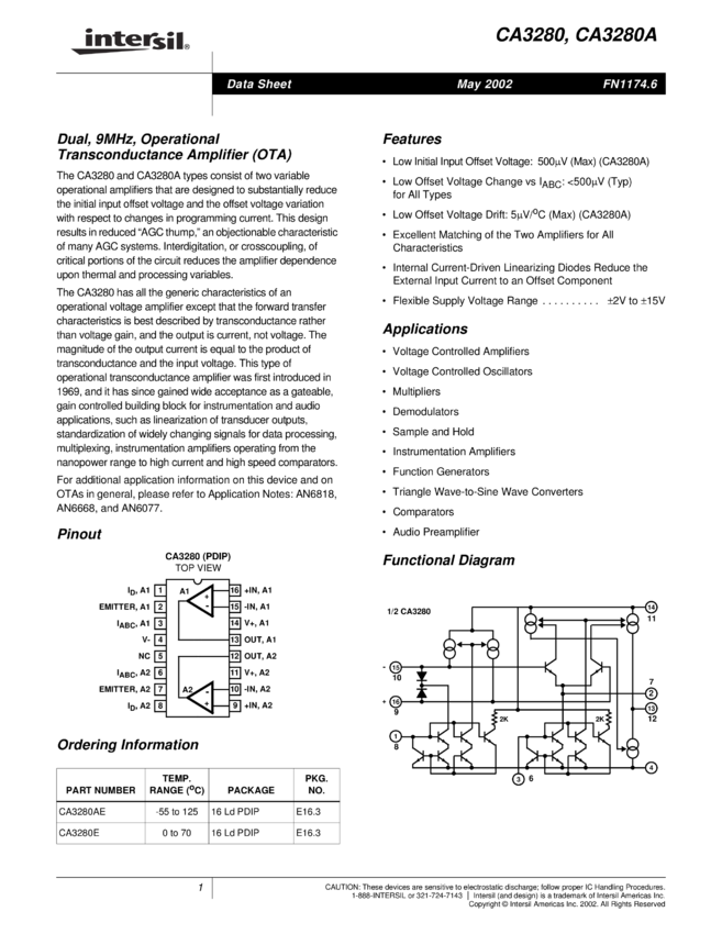 Dual, 9MHz, Operational Transconductance Amplifier (OTA)
