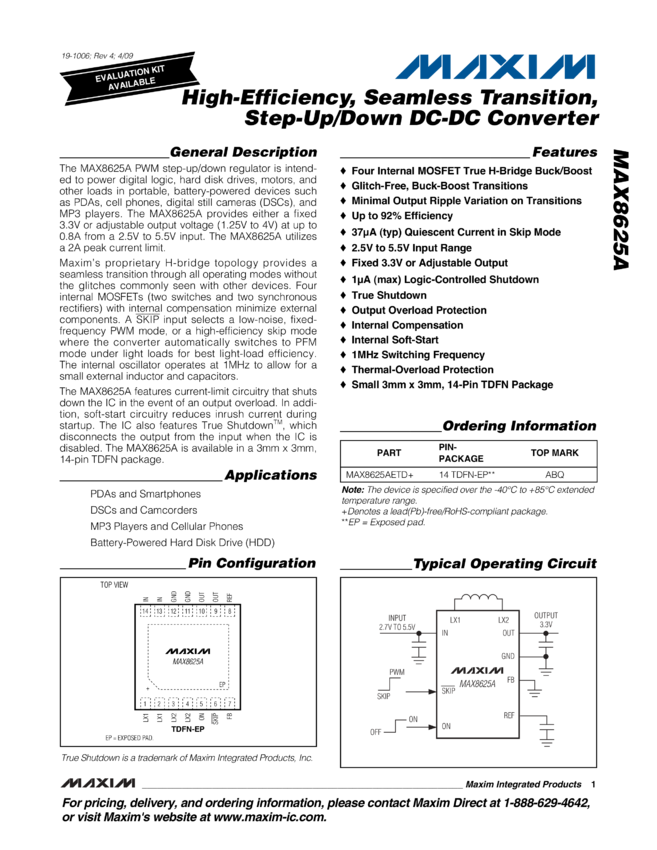 MAX8625A High-Efficiency, Seamless Transition, Step-Up/Down DC-DC Converter