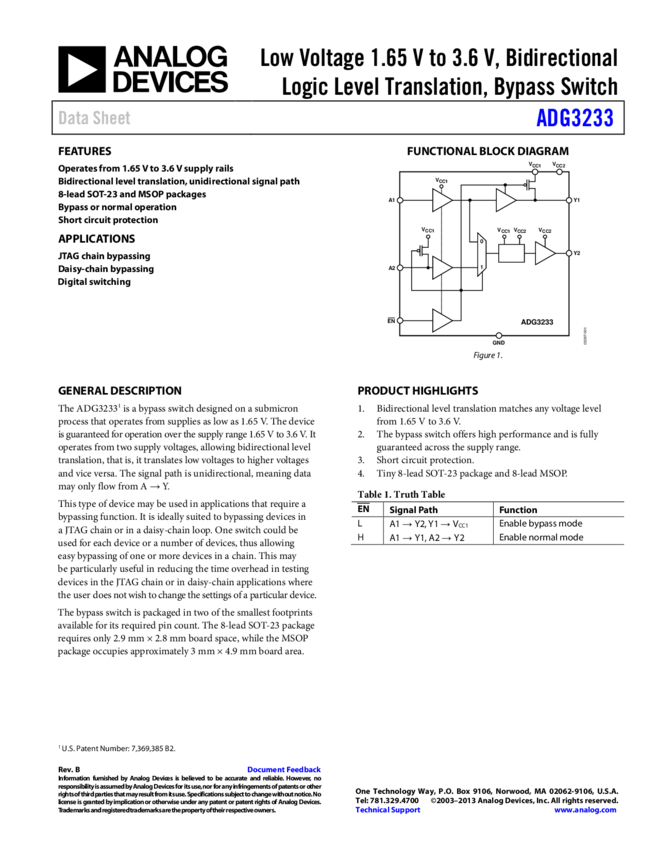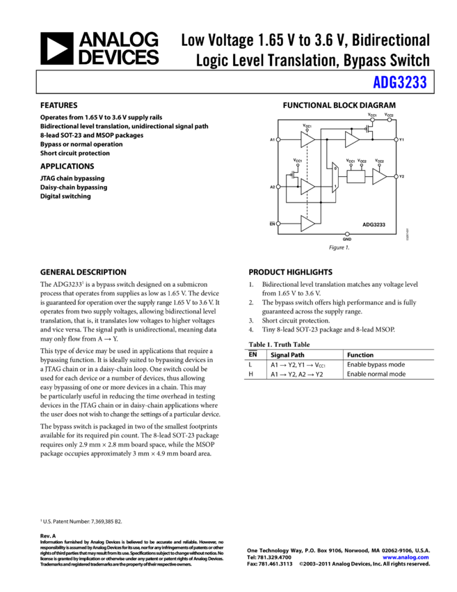 ADG3233: Low Voltage 1.65 V to 3.6 V, (Up/Down) Logic Level Translation, Bypass Switch
