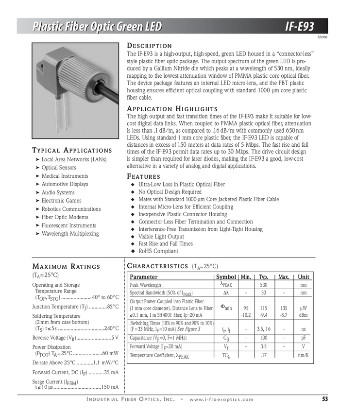 Nadajnik(Transmiter)LED - światłowodowy długość fali 530 nm pasmo 50 nm TR 3,5 ns; TF 16 ns zasięg < 150 m