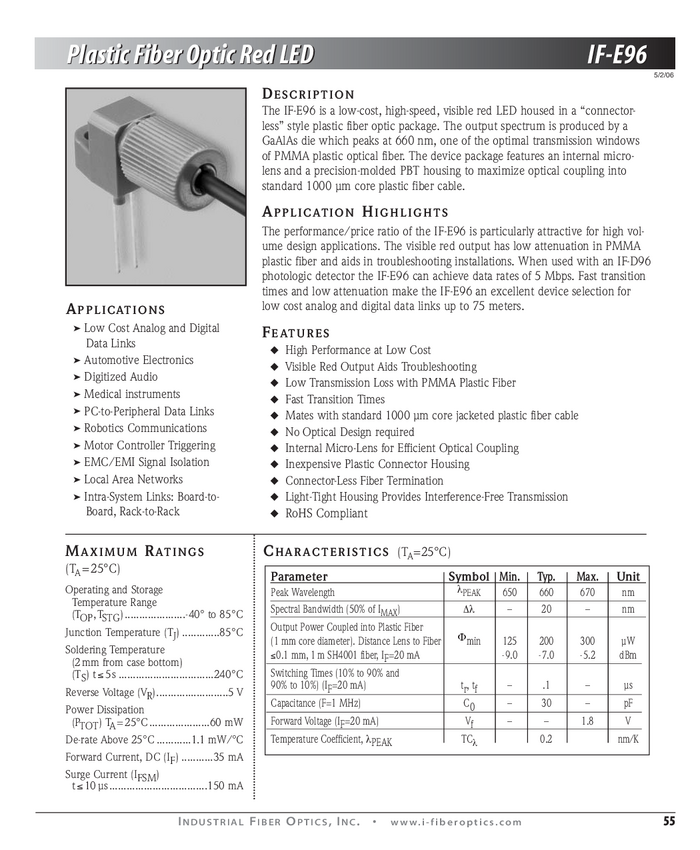 Nadajnik(Transmiter)LED - światłowodowy długość fali 660nm pasmo 20 nm TR 0,1us; TF 0,1us zasięg < 75 m