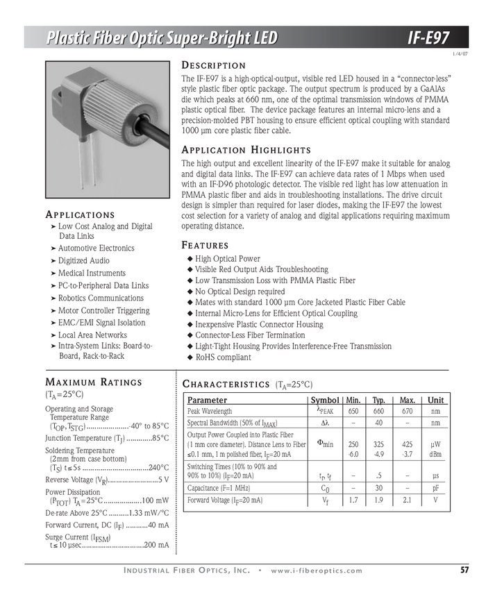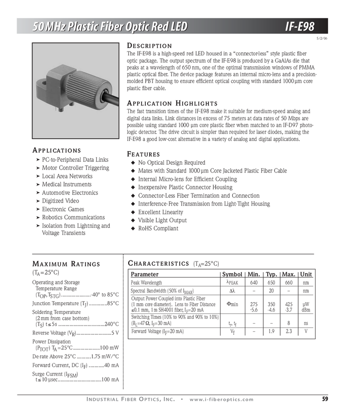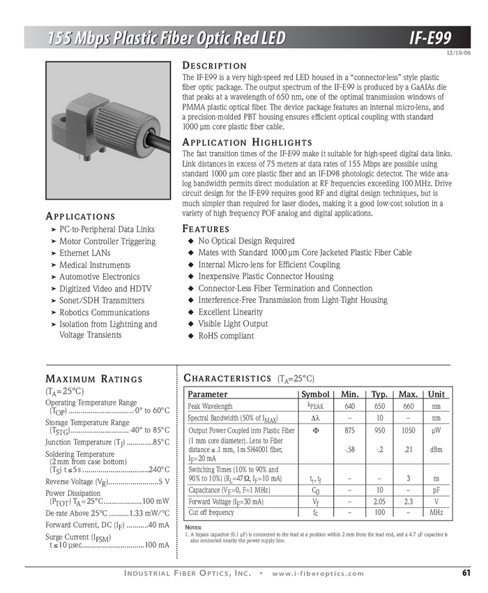 Nadajnik(Transmiter)LED - światłowodowy długość fali 650nm pasmo 10 nm TR 3,5 ns; TF 3,5 ns zasięg < 100m ( w parze z IFD98) Nieprodukowany następca IFE99B