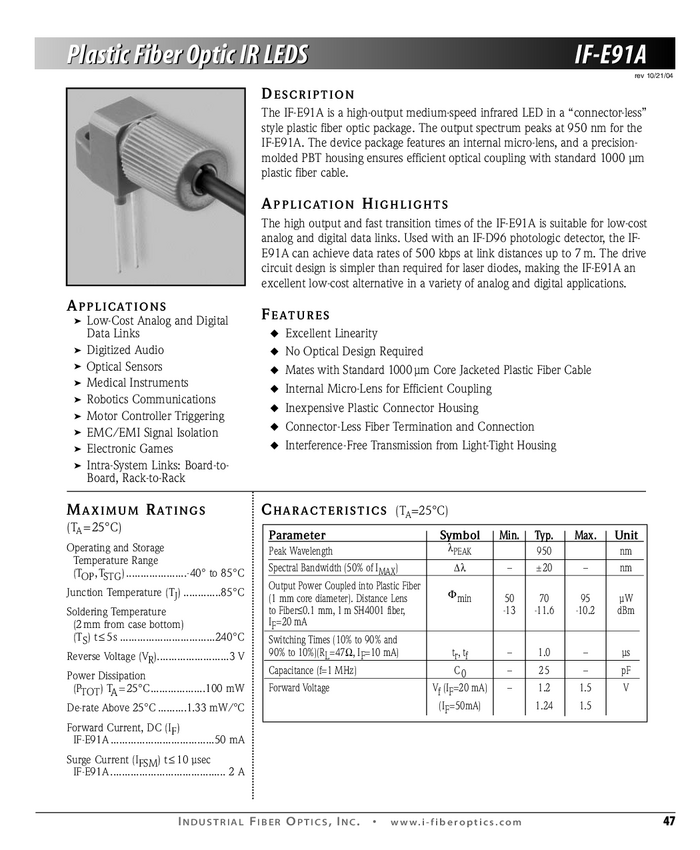 Nadajnik(Transmiter)LED - światłowodowy długość fali 950nm pasmo 40nm TR 1.0us; TF 1.0us zasięg < 10m