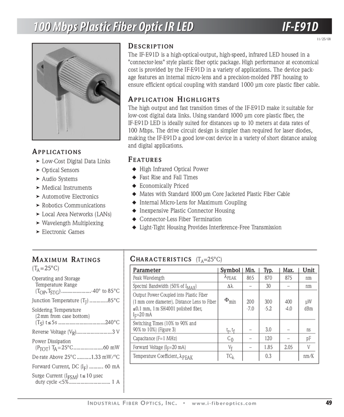 Nadajnik(Transmiter)LED światłowodowy długość fali 870nm pasmo 30 nm TR 3 ns; TF 3ns zasięg < 10 m