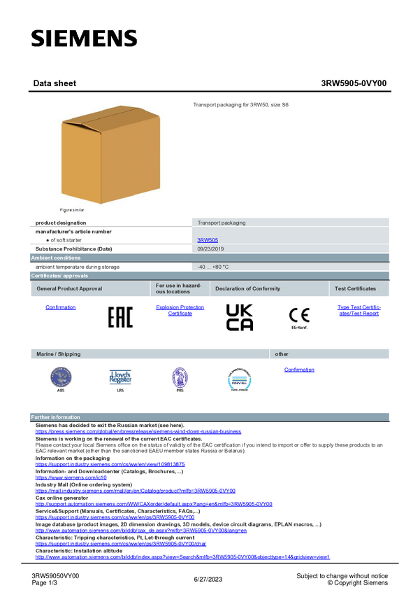 Opakowanie transportowe Siemens 3RW5951-0VY00 3RW59510VY00