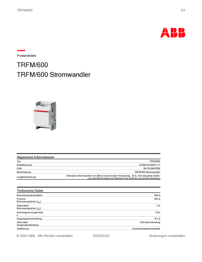 ABB TRFM/600 2CSM100160R1111 Przekładnik prądowy Prąd pierwotny 600 A Prąd wtórny 5 A Średnica otworu:155 mm 1 szt.