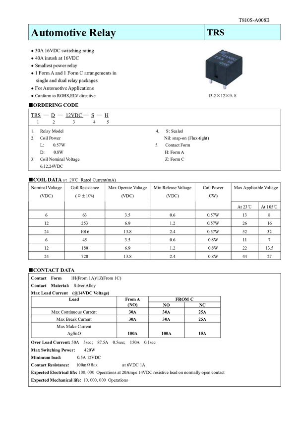 Przekażnik typu: Automotive; 1xU;SPDT; 30A 12V 253R wym. 13,2 x 12 x 9,8 mm; 0,57W; max 30V DC; AgSnO2; 10x10^6 cykli; -40+105 st; TRS-L-S-Z 12V DC
