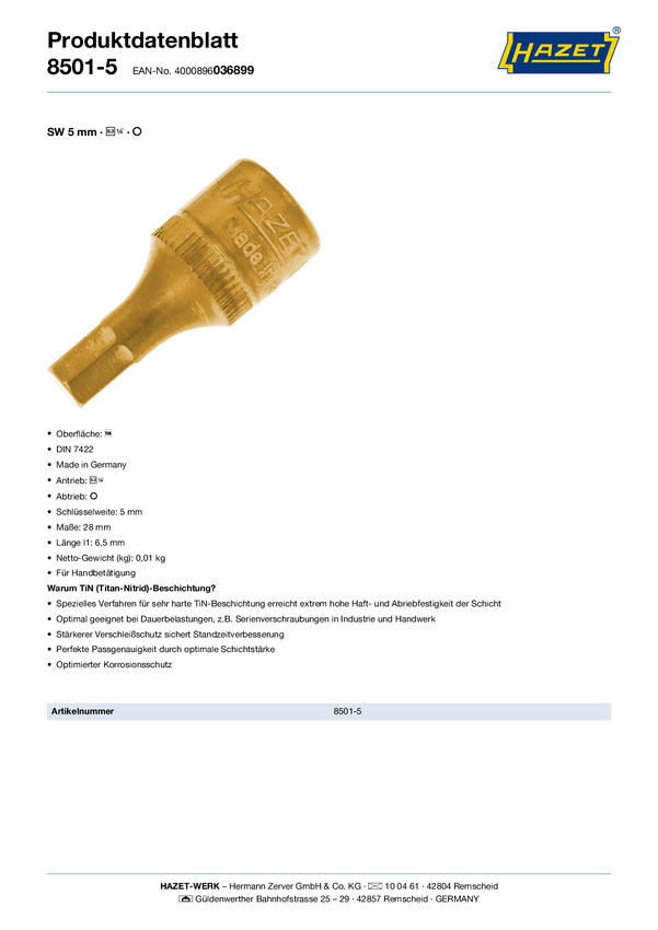 Hazet 8501 8501-5 wewnętrzny sześciokąt Nasadka trzpieniowa 5 mm 1/4" (6,3 mm)