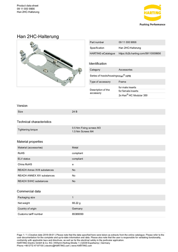 Ramka trzymająca Harting 09 11 000 9956, 1 szt.