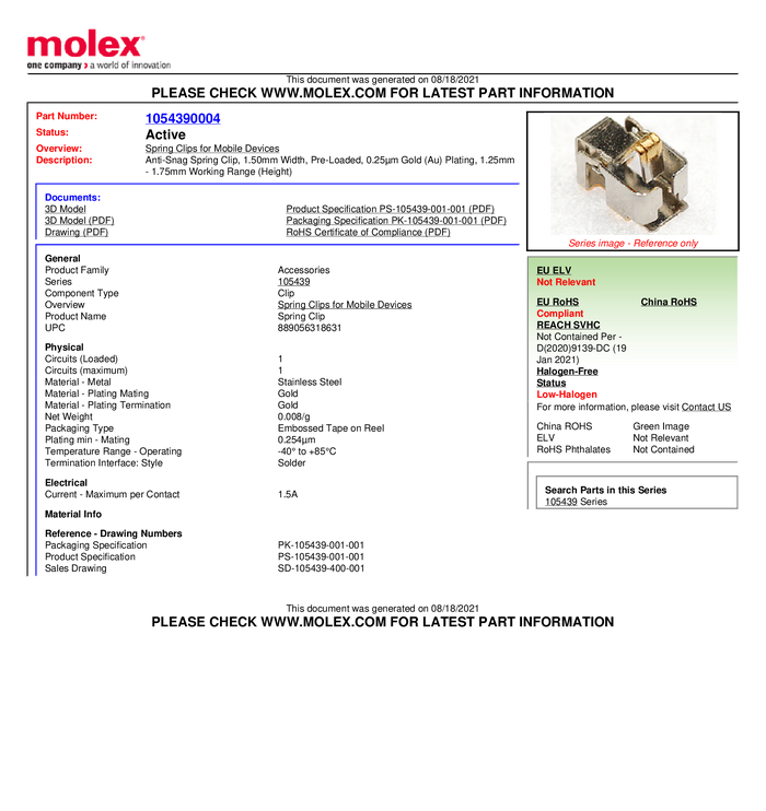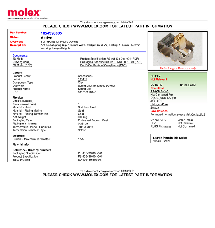 Molex 1054390005 Tuleja trzymająca, piny: 1, 1.5 A, 1 szt.