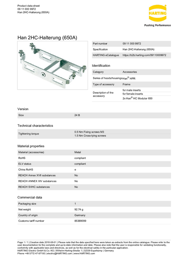 Ramka trzymająca Harting 09 11 000 9972, 1 szt.