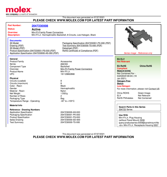 Molex Tuleja trzymająca Ilość pinów 8 2047230008 1 szt. torba
