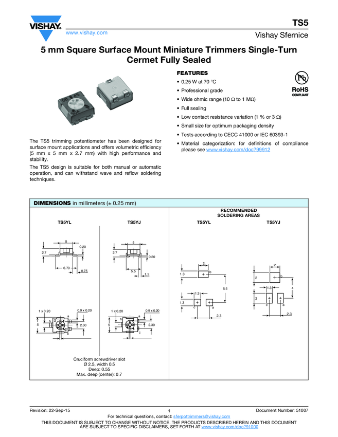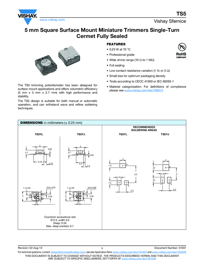 Res Cermet Trimmer 5K Ohm 10% 1/4W 1(Elec)/1(Mech)Turn 2.5mm (5 X 6.7 X 2.7mm) Gull Wing SMD T/R