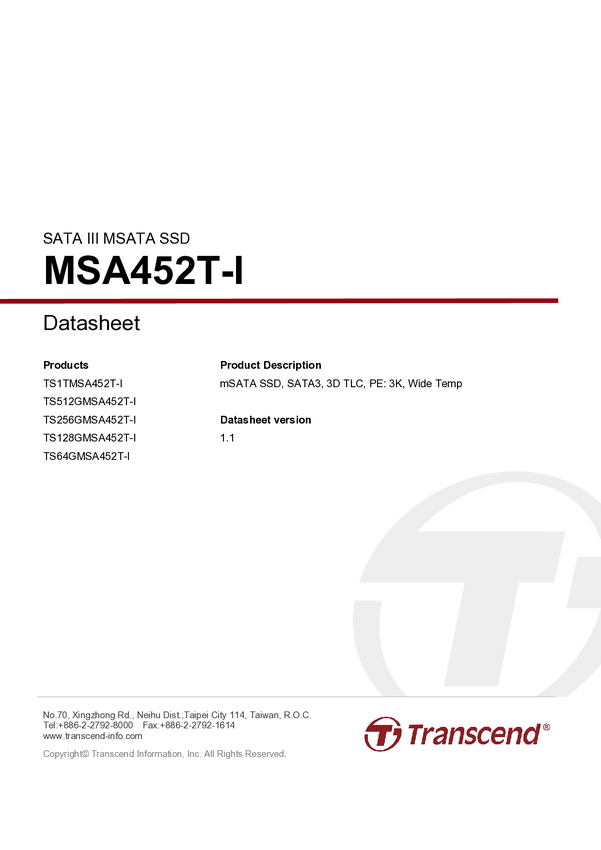 Transcend MSA452T2 512 GB Dysk wewnęrztny SSD mSATA SATA 6 Gb/s Przemysłowy TS512GMSA452T2
