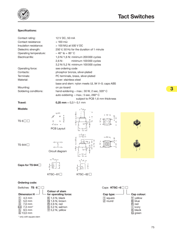 Switch Tactile N.O. SPST Square Button PC Pins 0.05A 12VDC 2.6N Thru-Hole