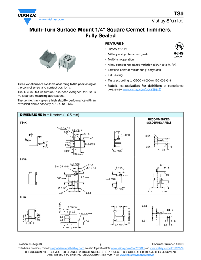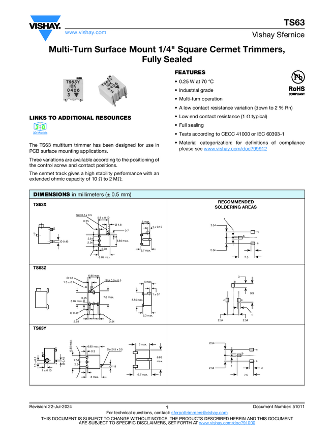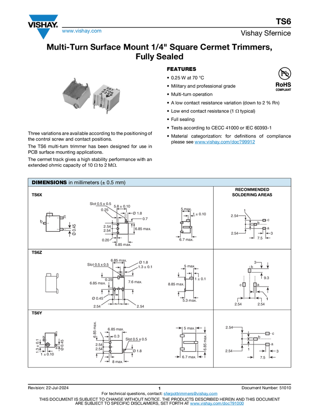 Multi-Turn Surface Mount 1/4" Square Cermet Trimmers, Fully Sealed
