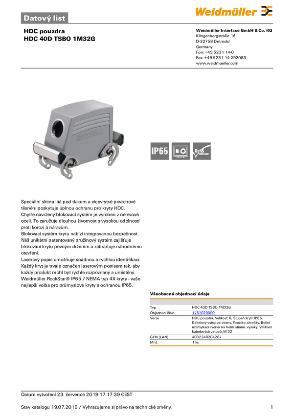 Weidmüller HDC 32A TSBO 1M25G 1787980000 Obudowa złącza męskiego 1 szt.