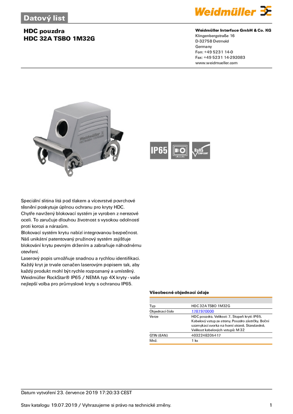 Weidmüller HDC 32A TSBO 1M32G 1787970000 Obudowa złącza męskiego 1 szt.