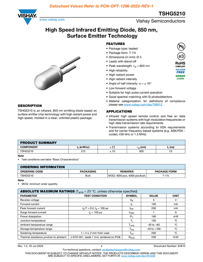 High Speed Infrared Emitting Diode, 850 nm, Surface Emitter Technology