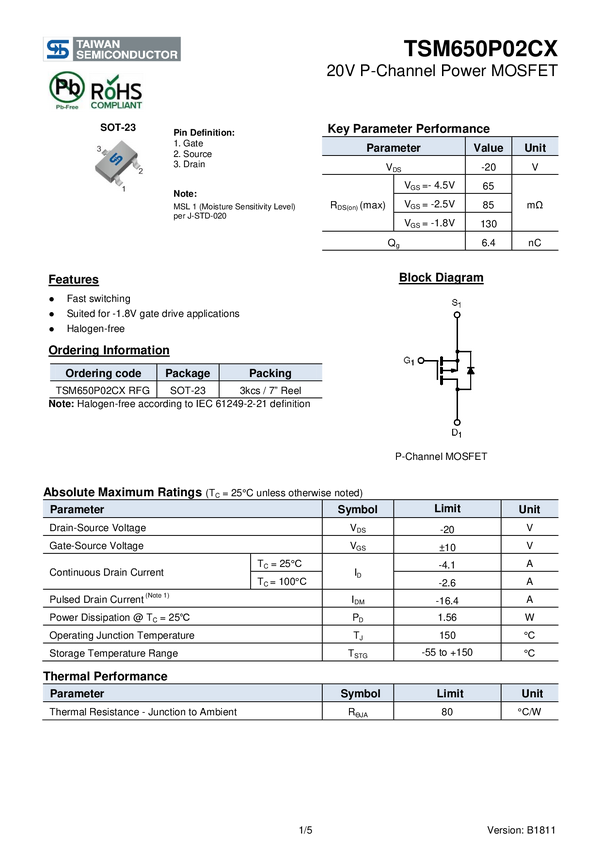 P-Ch 20 V 4,1 A 1,56 W 0,065 R SOT23 Taiwan Semiconductor TSM650P02CX RFG N/A N/A TSM650P02CX RFG