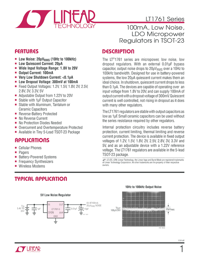 100mA, Low Noise, LDO Micropower Regulators in TSOT-23
