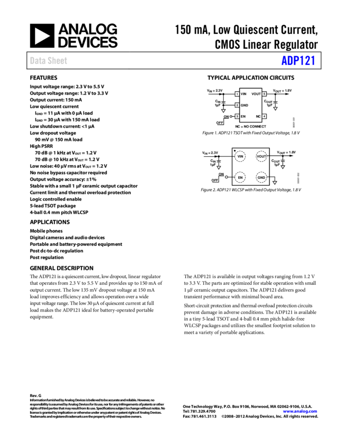 150 A, Low Quiescent Current, CMOS Linear Regulator in 5-Lead TSOT or 4-Ball WLCSP