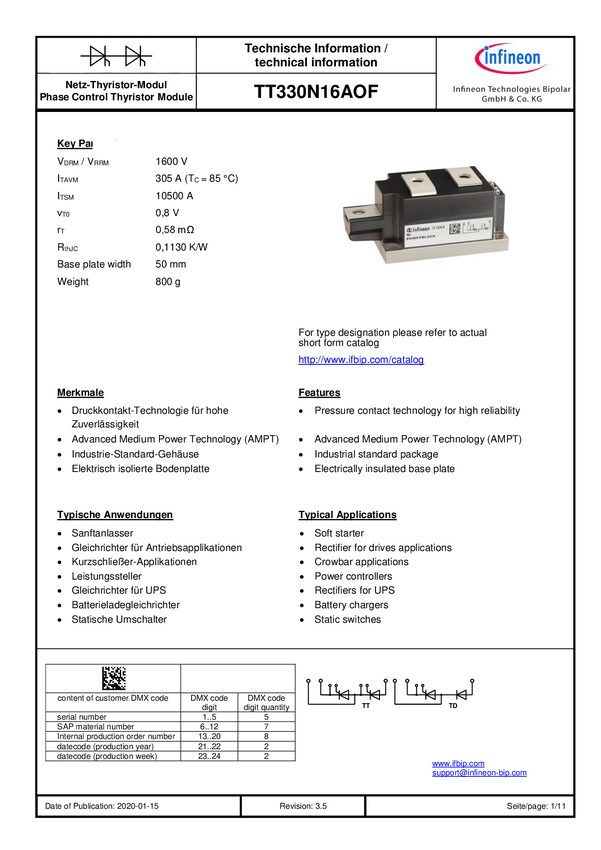 50 mm Thyristor/Diode Module with 1600 V in pressure contact technology Thyristor/Diode 50 mm Power Block 1600 V, 330 A module for phase control with high reliable pressure contact technology. Also available with pre-applied thermal interface material.
