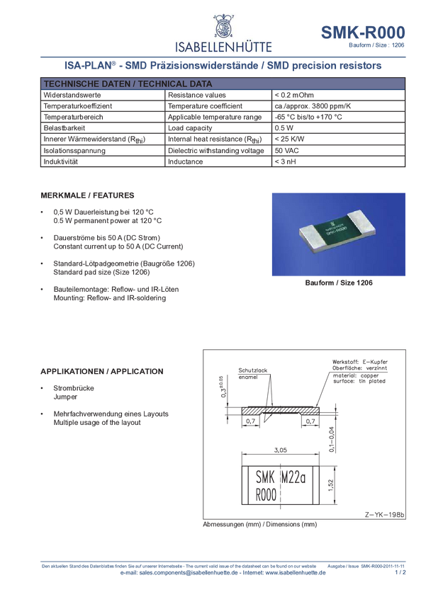 Isabellenhütte SMK-R000 SMK-R000 Rezystor SMD 0 Ω SMD 1206 1 W 1 % 50 ppm/K 1 szt.