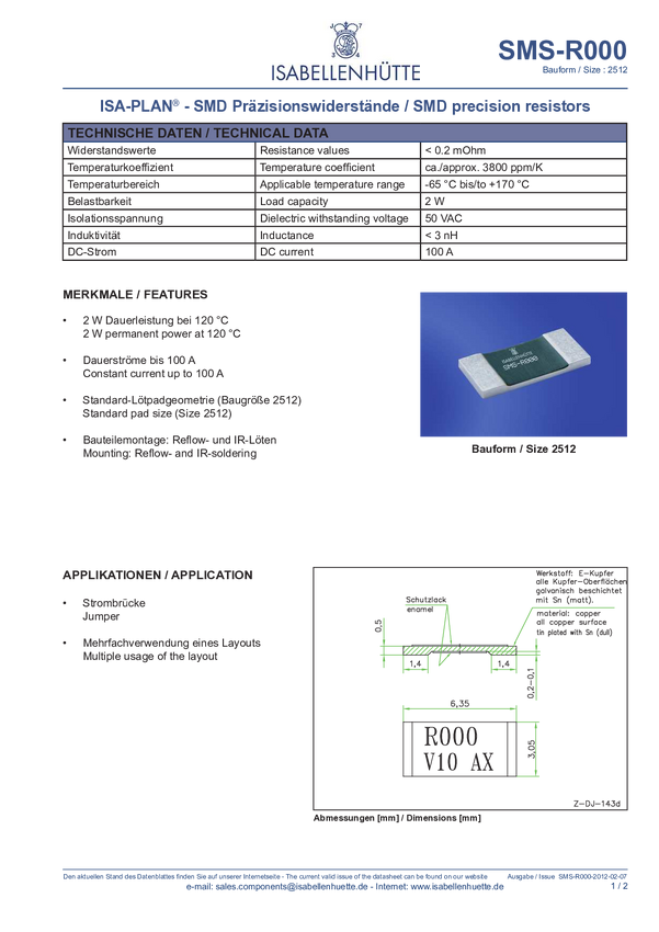 Isabellenhütte SMS-R000 SMS-R000 Rezystor SMD 0 Ω SMD 2512 3 W 5 % 50 ppm/K 1 szt.