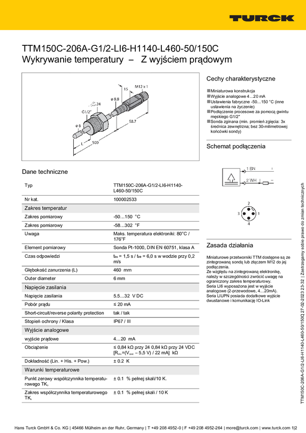 Turck 100002533 TTM150C-206A-G1/2-LI6-H1140-L460-50/150C Czujnik temperatury