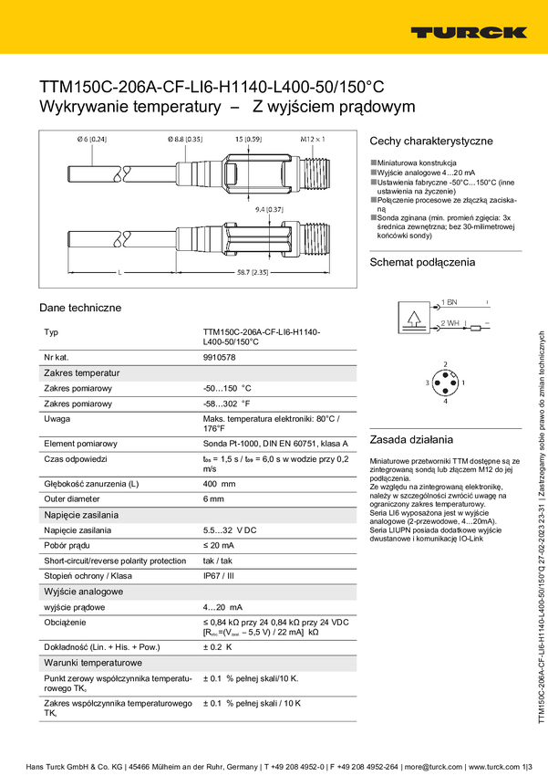 Turck 9910578 TTM150C-206A-CF-LI6-H1140-L400-50..150°C Czujnik temperatury