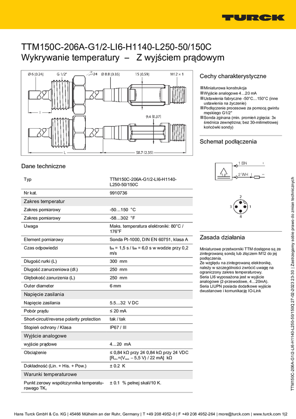 Turck 9910735 TTM150C-206A-G1/2-LI6-H1140-L050-50/150C Czujnik temperatury