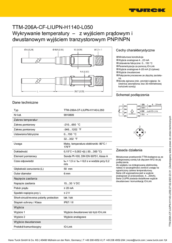 Turck 9910624 TTM-206A-CF-LIUPN-H1140-L100 Czujnik temperatury