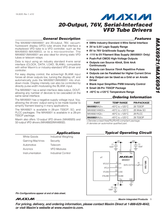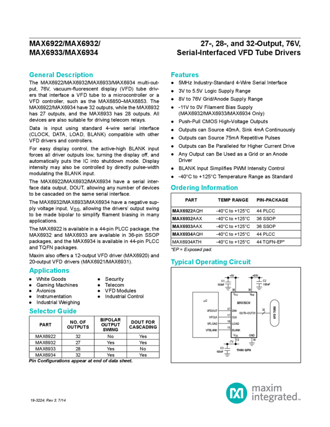 MAX6922, MAX6932, MAX6933, MAX6934 27-, 28-, and 32-Output, 76V, Serial-Interfaced VFD Tube Drivers
