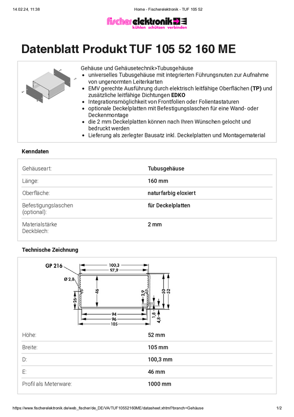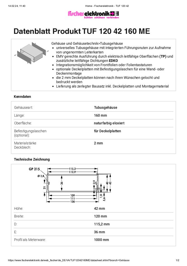 Fischer Elektronik TUF 120 42 160 ME TUF 120 42 160 ME Obudowa profilowa 120 x 42 x 160 aluminium eloksydowane srebrny 1