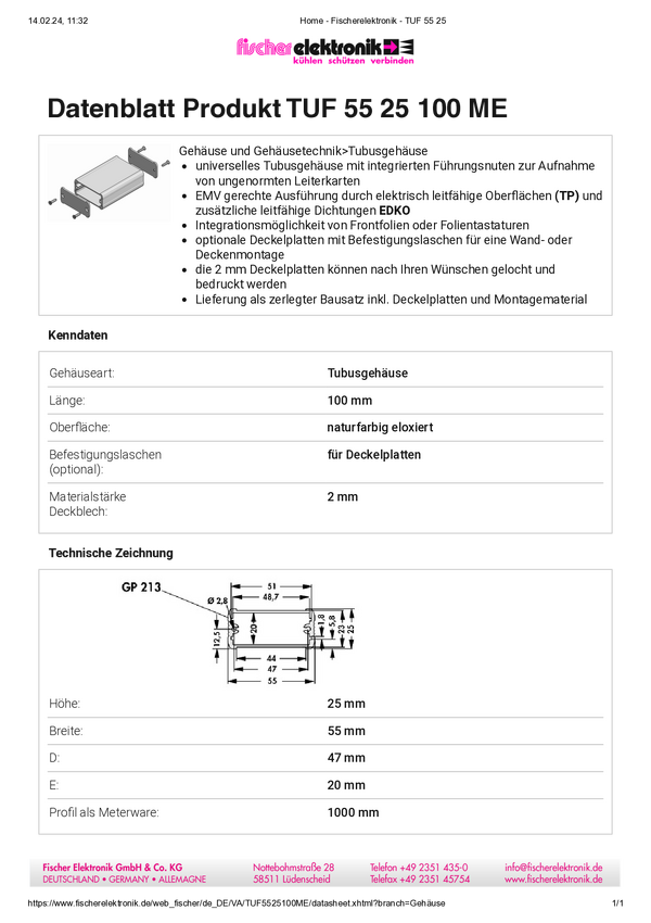 Fischer Elektronik TUF 55 25 100 ME TUF 55 25 100 ME Obudowa profilowa 55 x 25 x 100 aluminium eloksydowane srebrny 1 sz