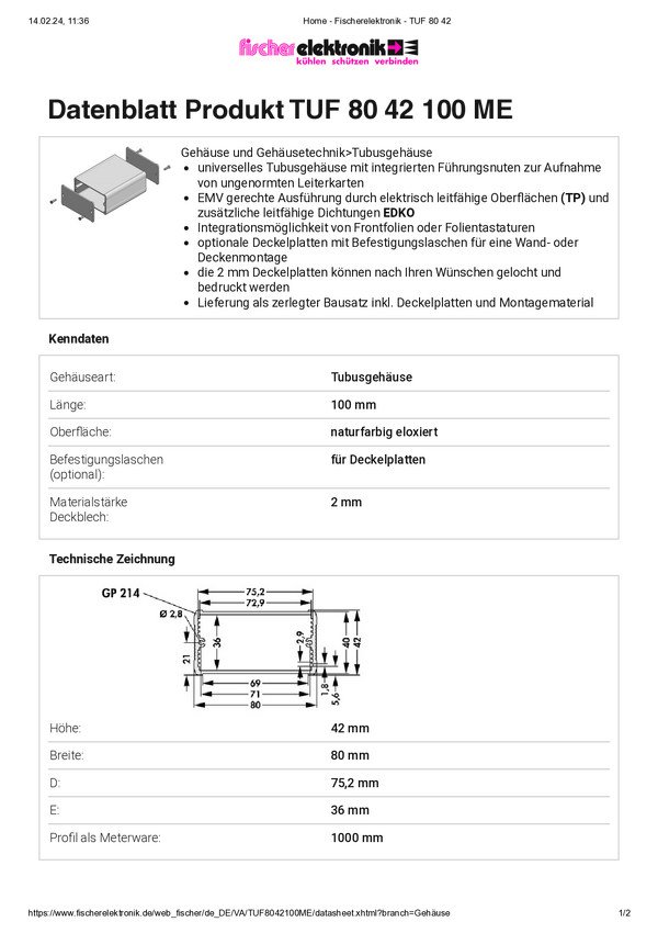 Fischer Elektronik TUF 80 42 100 ME TUF 80 42 100 ME Obudowa profilowa 80 x 42 x 100 aluminium eloksydowane srebrny 1 sz