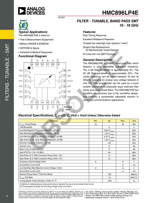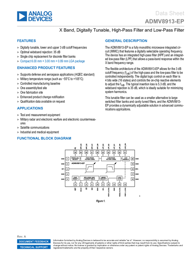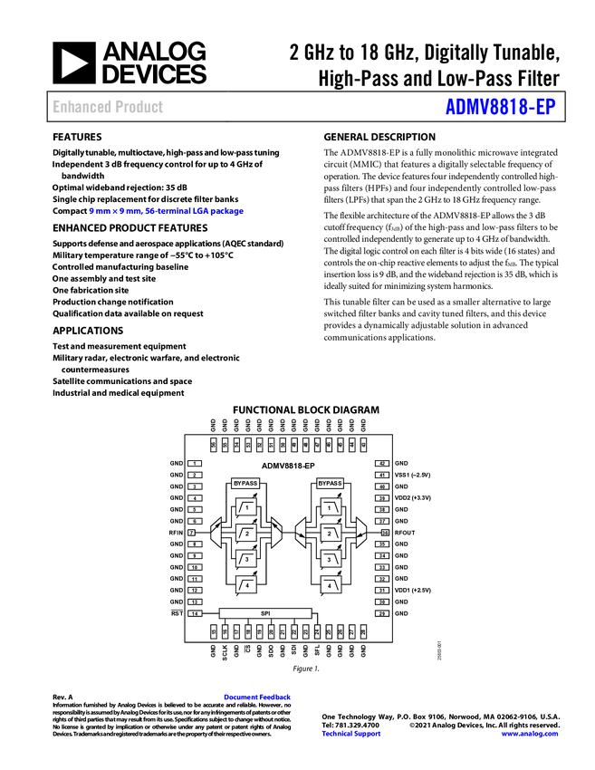 2 GHz to 18 GHz, Digitally Tunable, High-Pass and Low-Pass Filter