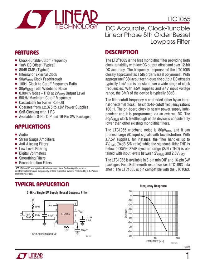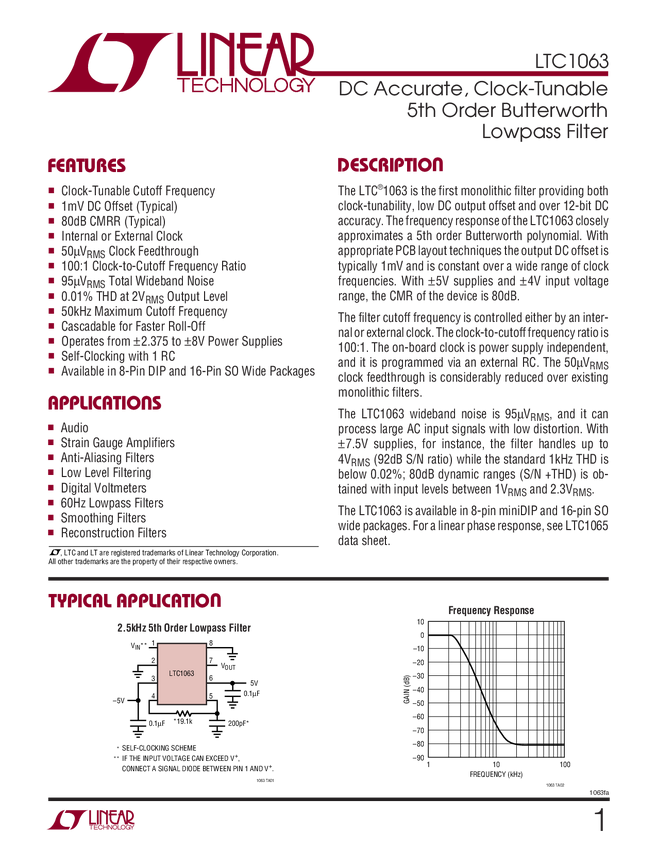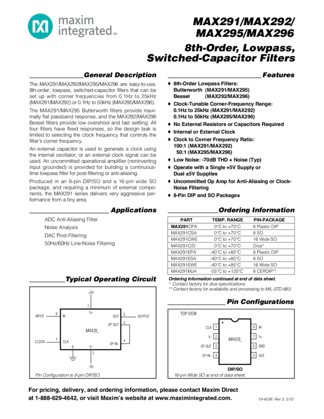 MAX296 8th-Order, Bessel, Clock-Tunable, 50:1 Lowpass Filter