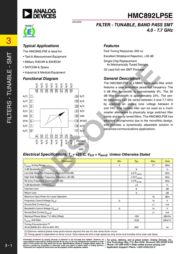 Filter - Tunable, Band Pass SMT, 4 - 7.7 GHz