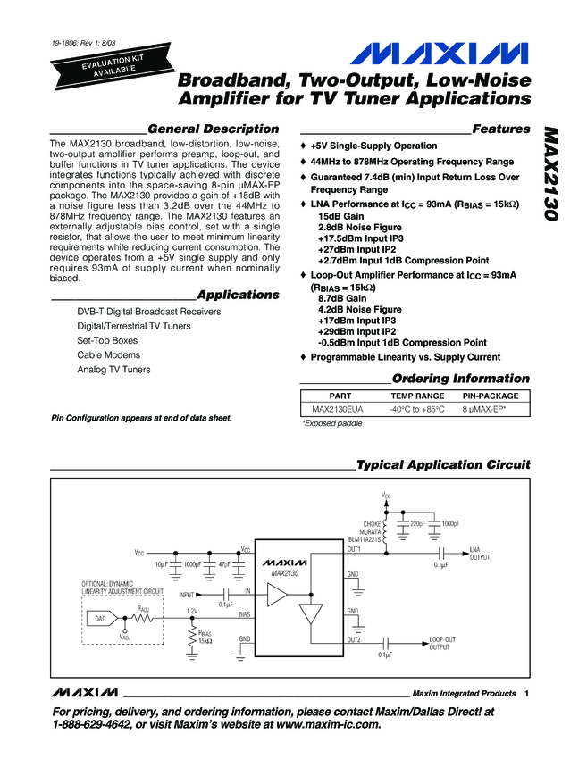 MAX2130 Broadband, Two-Output, Low-Noise Amplifier for TV Tuner Applications
